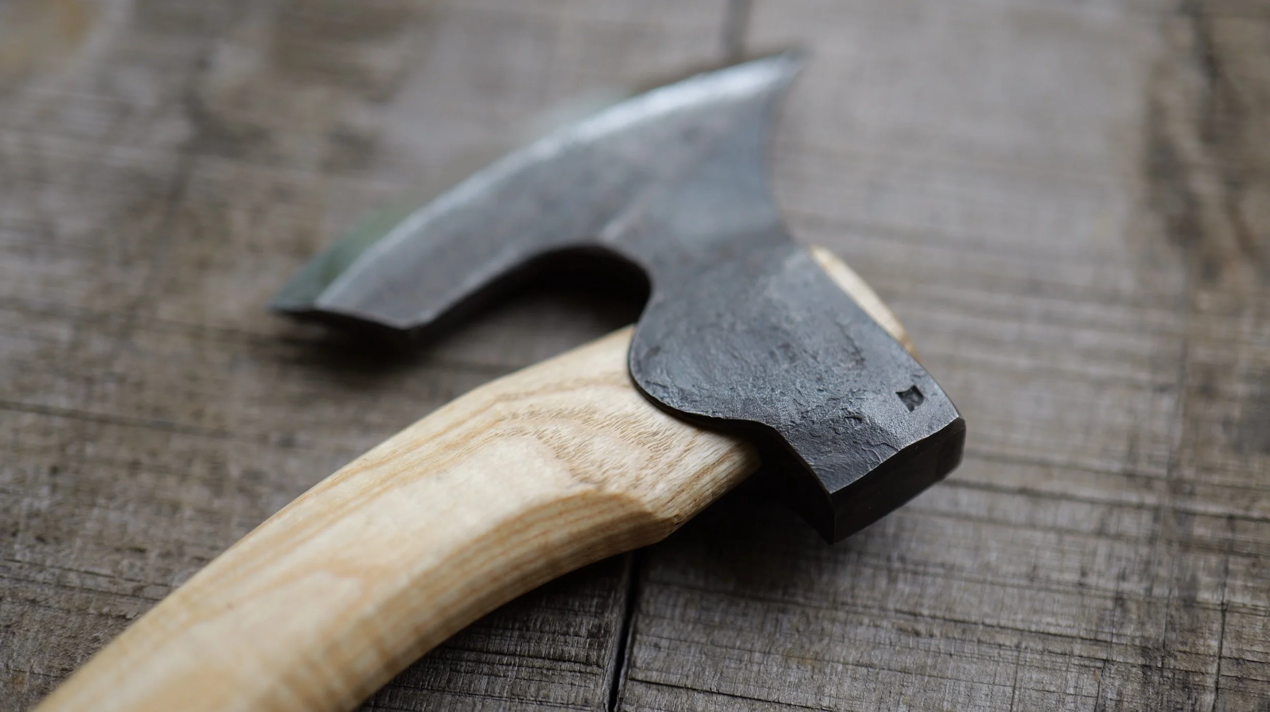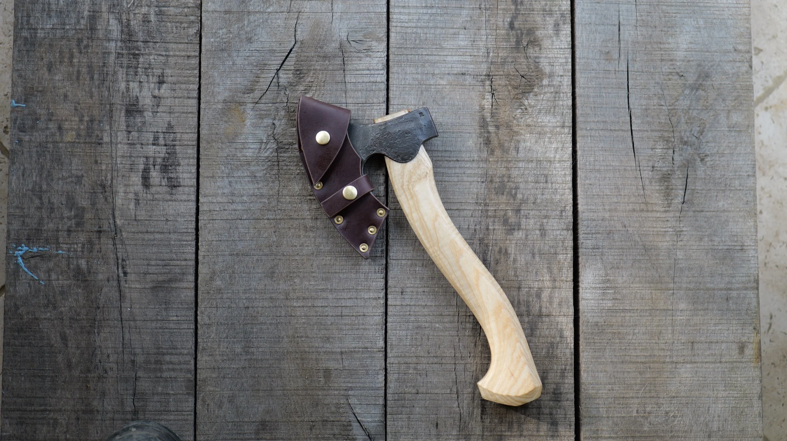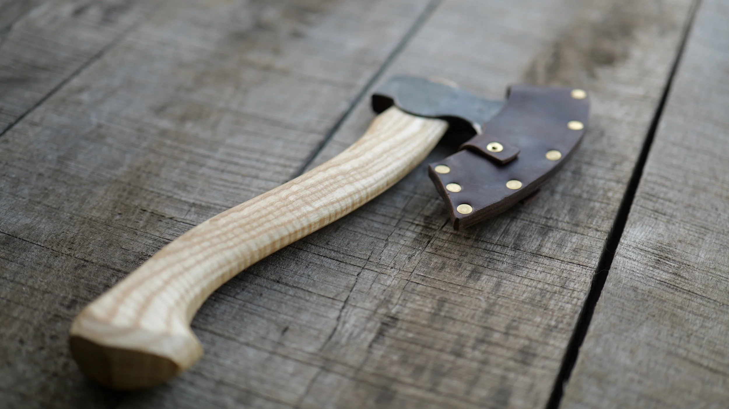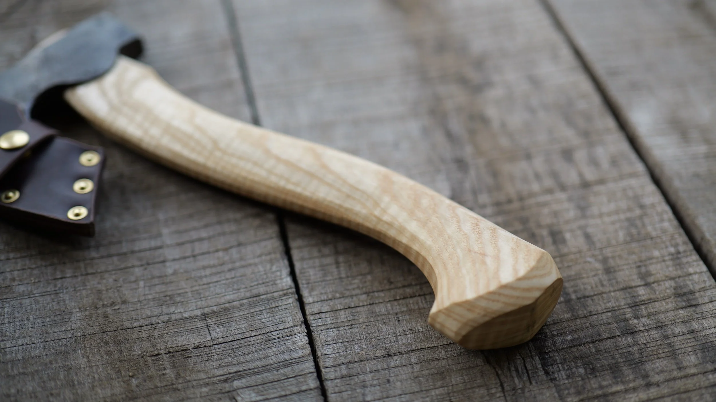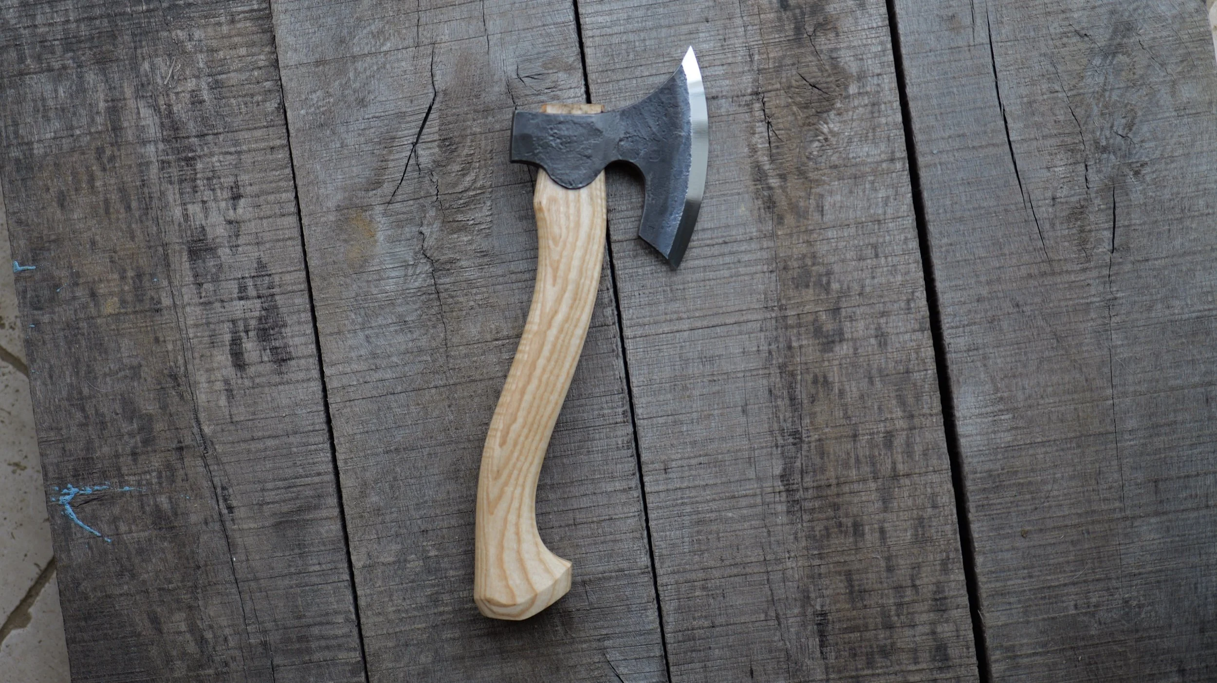 A recurved handle and an extra broad cutting edge make this a super slicy axe and still light and compact.